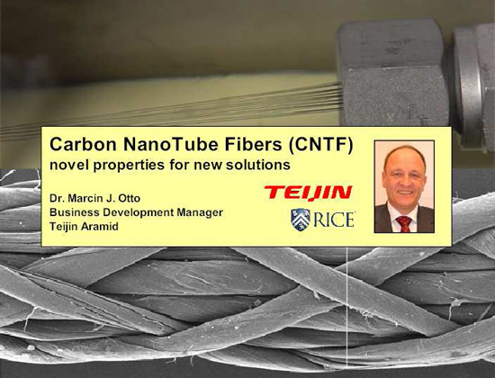 Al jaren werken toonaangevende onderzoekers van Rice University, waaronder Nobelprijswinnaar Richard Smalley (scheikunde, 1996), en onderzoekers van Teijin Aramid Arnhem samen aan de productie van koolstofnanobuizen en het opbouwen ervan tot nuttige macroscopische objecten met nieuwe, ongekende prestaties. Om een hoogwaardig textiele draad (vezel) van koolstofnanobuizen te spinnen, moeten de nanobuizen perfect langs de as van de vezel gestapeld en georiënteerd zijn. De efficiëntste manier om deze hoogwaardige vezels te maken, is het oplossen van de CNT’s in chloor sulfoon zuur, gevolgd door natspinnen. Dit gepatenteerd proces wordt sinds de jaren zeventig gebruikt voor de productie van de Twaron-supervezel van Teijin Aramid.