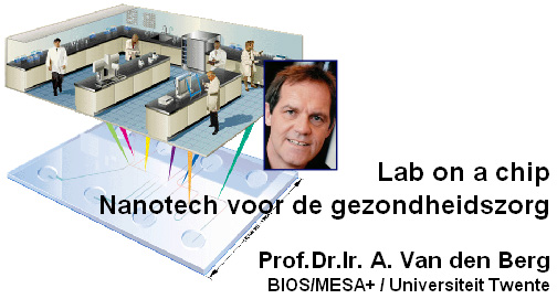 Na een korte introductie van de begrippen “Nanomedicine” en “Lab-on-Chip” (LOC) zal worden ingegaan op verschillende toepassingsmogelijkheden van deze nieuwe technologieën in de gezondheidszorg. Nanodeeltjes zijn bv. van groot belang bij imaging en targeted drug delivery. Met behulp van micro- en nanokanaaltjes kunnen medische devices worden gebouwd voor bijvoorbeeld de monitoring van medicijnen of biomarkers in bloed, zoals in het voorbeeld van de lithium chip voor thuismeting door manisch-depressieve patiënten.