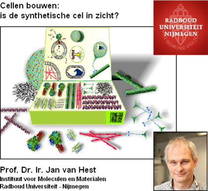 De levende cel is een fascinerende bron van inspiratie voor biologen, medici en chemici. Om beter te begrijpen hoe een cel functioneert en hoe leven is ontstaan, willen we graag proberen cellen na te bouwen, en kijken wat minimaal nodig is om een cel te laten werken. Daarbij zijn er twee routes te onderscheiden. Synthetisch biologen passen een “top-down” benadering toe, en kleden een bestaande levende cel uit tot er een minimale cel overblijft die nog steeds functioneert. Chemici werken vanaf de andere “bottom-up” kant. Door gecontroleerde assemblage van slimme moleculen wordt geprobeerd om cel-achtige structuren op te bouwen. In deze lezing zal ik de meest recente ontwikkelingen bespreken die dit uitdagende doel dichterbij hebben gebracht. Daarbij zal ik voornamelijk ingaan op de chemische benadering, waarbij synthetische cellen en cel-onderdelen worden opgebouwd die in een aantal aspecten hun natuurlijke voorbeelden nabootsen.